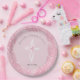 Dieser hübsche und weibliche erste Papierplattenentwurf der heiligen Kommunion kann für die spezielle religiöse Gelegenheit Ihres Mädchens besonders angefertigt werden. Die Text- und Hintergrundfarbe kann zu Ihrem Mögen geändert werden. Sie kennzeichnet ein stilvolles illustriertes Kreuz sowie rosa Hydrangea-Blumen. Zusammenpassende Einladungen und andere Papierwaren für Ihre Feier sind verfügbar.