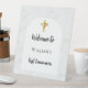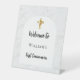 Marmorprint als Hintergrund und ein weißer bogenförmiger Rahmen. Ein goldenes Kreuz. Personalisieren und einen Namen hinzufügen. Zurück: kein Design