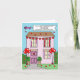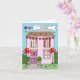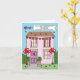 Eine einfache Illustration eines rosa Hauses, das mit herzenförmigen Ballons und Bollen dekoriert ist. Hinter dem Haus befindet sich ein Flugzeug, das einen Banner trägt, der besagt: "Glücklicher erster Valentinstag als Ehepaar zu einer ganz besonderen Tochter und Sohn im Rechtswesen".