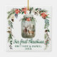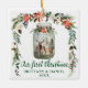 Elegantes Kalligraphie-Script, Unser erstes Weihnachtswatercolor Winter Floral Deer Ornament umfasst rote Poinsettien, weiße Rose, Kiefernzapfen, Baumwolle und Wintergarten. Wasserfarbener Mason Glas mit Reh und Buck im Pinienwald.