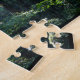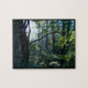 Brillante, weiße Sonnenstrahlen der Morgensonne, die von hinter dunklen Ästen in einen üppigen, grünen Sommerhwald strömen, mit massiven Efeu-Bäumen und fruchtbarem Unterholz.