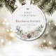 Erstes Weihnachten als Geschäftsinhaber Personalisiert mit Namen und Jahr Ganzjahres-Acrylsouvenir-Ornament-Geschenk... Ein zartes Bouquet aus rosa Rosen, Kiefernzapfen und weihnachtlichen Botanicals schmückt den rose-goldenen Metallring, der den Text deines weihnachtlichen Ornament-Geschenks für neue Geschäftsinhaber umrahmt. Der Beispieltext auf diesem Souvenir-Ornament lautet "Erstes Weihnachten als Geschäftsinhaber" in eleganter Serif-Typografie, gefolgt vom Namen der Person und dem aktuellen Jahr. Der gesamte Text kann im Personalisierungs-Template einfach geändert werden.