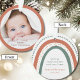 Baby's First Christmas Personalisiert mit Namen, Geburtsdatum und Foto Runde Acryl-Andenken-Weihnachtsdekoration... Auf der Vorderseite unseres "Baby's First Christmas"-Andenken-Schmucks befindet sich das Foto des Babys und der Beispieltext "Merry First Christmas". Auf der Rückseite befindet sich ein fantastischer handgezeichneter Weihnachtsregenbogen in Terrakotta- und Fichtengrüntönen, der den Beispieltext "My Very First Christmas on Planet Earth" umrahmt, gefolgt vom Namen und Geburtsdatum des Babys. Der gesamte Beispieltext und das Platzhalterfoto können auf der Personalisierungsvorlage einfach mit Ihren eigenen Angaben geändert werden.