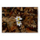 Weißer Krokus blüht auf einem Feld brauner Blätter.