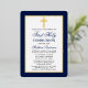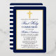 Elegante Navy Blue und Gold Erste Heilige Kommunion Einladung mit Kreuz. Goldfolie. Goldfolienkreuz. Runde Kanten. Zurück gestreift.