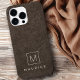iPhone Gehäuse mit einem bedruckten, dunkelbraunen Ledertexturbild und Ihrem Namen und Monogramm-Initial in einem modernen serifenlosen Schriftart.