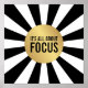 "Es geht um Fokus" Inspiration Zitat Poster auf Gold Emblem mit modernem Schwarz-Weiß-Muster.