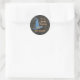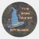 Ein lustiger runder Aufkleber mit einem blauen verzauberten Hexenhut, der auf einem dunklen Holzkohle-schwarzen Hintergrund "It's the Witching Time Of Year, Happy Halloween" steht.