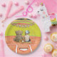 Baseball-Teller zum Thema Babydusche. Ein niedlicher Junge mit Baseballkappe, der neben seinem Freund von Teddy auf einem Baseballfeld sitzt.