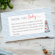 Diese charmante Wassersportkarte ist ein herzliches Mittel, um Gäste zu einer geliebten Geschichte einzuladen, die eine persönliche Nachricht in sich trägt. Ihr Buch wird jahrelang geschätzt und die Kinderbibliothek mit Liebe, Abenteuer und Erinnerungen von lieben Freunden und Familie gefüllt. Diese Kabine ist eine perfekte Ergänzung zu Ihrer nautischen Babydusche und zeichnet sich durch ein elegantes maritimes Design mit klassischen Marine- und Weißtönen aus.