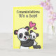 Eine individuell anpassbare Grüße-Karte für neue Eltern mit einem Cartoon Panda Bär, der einen Babybären für Schläger und Kuscheln in die Luft hebt. Der Text lautet "Gratulationen es ist ein Junge", aber Sie können den gesamten Text an Ihre Bedürfnisse anpassen.