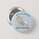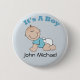 Passen Sie diese blaue Taste mit dem Namen des Babys an. Button hat ein krabbelndes Baby in einem Windel und im Shirt. Es ist ein Junge, der oben geschrieben ist. Ideal für Gastgeschenke mit Babydusche