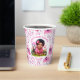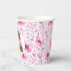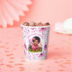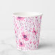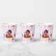 Niedlich ist es ein Baby-Dusche Papier Becher mit einem niedlich afroamerikanischen Baby mit einer rosa Blume in ihren Haaren, Hübsch rosa Blumenuntergrund mit rosa und grünem Text.