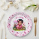 Niedlich ist es ein Mädchen Duschpapier Teller mit einem niedlich afroamerikanischen Baby mit einer rosa Blume im Haar, Hübsch rosa Blumenhintergrund mit rosa und grünem Text.