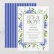 Die blaue Hydrangea-Babydusche "It's A Boy!" ist elegant, traditionell, modern und dennoch klassisch. Es ist atemberaubend mit seinen wunderschönen, mehrfarbigen Hydrangeas und seiner weich-natürlichen Vegetation. Es hat einen koordinierenden blauen Streifen zurück. Es ist perfekt für die Babydusche Ihres oder Ihrer Lieben.