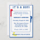 Die Design-Front weist eine anpassbare Überschrift auf: "It's a Boy!" in hellen, blauen Buchstaben vor einem weißen Hintergrund. Ihr Text wird in hellblauen Buchstaben gegen einen weißen Rücken dargestellt. Hintergrund Bild ist von den Buchstaben, "ABC" in Primärfarben. Um das Design herum wird ein blauer Rahmen angezeigt. Der gesamte Text ist anpassbar. Das hintere Design bietet "ABCD" in hellen Farben als Hintergrund. Konzipiert zur Koordination mit der "ABC Baby Shower Collection".