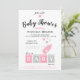 Niedliche Babydusche mit einer Babyflasche Silhouette in Rosa, kleine Herzen in Grau und Rosa und Kinderwürfel in Rosa und Grau. Freuen Sie sich auf ein fröhliches und stilvolles Babyduschdesign. Einfach zu personalisieren, indem Sie den Text durch Ihren eigenen ersetzen.