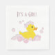 Niedlicher, gelber Gummidick, der in rosa Bläschen mit den Worten schwimmt. Es ist ein Mädchen für die Babydusche.