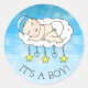 Es ist ein Boy, Baby Shower oder Birth Announcement Classic Round Aufkleber für Siegel Einladungen oder Geburtshinweise. Kaukasisches Baby schläft auf einer Wolke mit Sternen und Herzen.