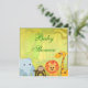 Eine lustige Dschungelszene mit Bäumen, Weinreben und einem Fluss als Hintergrund und einem Elefanten, Affen, Löwen und Giraffe auf der Suche. In einem Glitzer wie Rahmen. Ideal für einen Jungen oder eine kleine Babydusche.