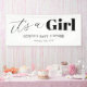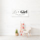 Modernes Babyduschbanner mit schlichtem, weißem Hintergrund, dem Titel "Es ist ein Mädchen" und einer eleganten Vorlage, die leicht zu personalisieren ist.