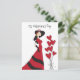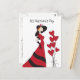 Mädchen in einem roten Kleid, schwarzer Hut und lange schwarze Handschuhe und sieben Herz Ballons schweben von ihr.