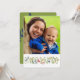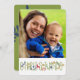 Dekorativ Es ist eine personalisierte Weihnachtsfotokarte mit Schneeflocken, Blätter, Beeren, Hirschen, Birnen und Grüntext, die CHRISTMAS mit einem Bereich zum Hinzufügen Ihres Fotos auf der Vorderseite, einem grünen Hintergrund mit blauem Blattsprig auf der Rückseite und einem Bereich zum Hinzufügen Ihres Namens und Ihrer Botschaft sowie des laufenden Jahres.