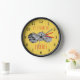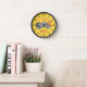 "Es ist Zeit zum Cochet" steht auf einer Runde, die mit einem schwarzen, grauen und weißen Garnsockel, zwei hellroten Häkelhaken und einem senfgelben Hintergrund geschmückt ist. Es ist das perfekte Geschenk für den Kunsthandwerksraum oder für jeden, der Lieben zum Häkeln hat. Die Uhr hat schwarze Hände und Zahlen.
