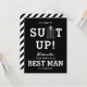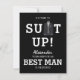 Personalisierte Vorschlagskarten - Werden Sie das sein? Vergnügen, jemanden fragen, um Ihr Trauzeuge, Trauzeuge, Ring Besteller, Hochzeitsbeamter usw. zu sein. Mit einem schwarzen Hintergrund, der in eine beliebige Farbe geändert werden kann, den Worten "ANZUG UP!" mit dem "i" in Form eines Smoking und einer Vorlage, die zu personalisieren ist.