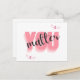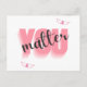Mit dieser wunderschön gestalteten Postkarte mit der aufregenden Botschaft "YOU MATTER" in fett formatierter Typografie, die durch sanfte Rosatöne und zarte Flügel geprägt ist, können Sie Hoffnung und Ermutigung vermitteln. Das beiliegende, rosa Farbbanddetails auf dem Rücken symbolisiert Stärke und Unterstützung, was es perfekt für jeden macht, der Brustkrebs bekämpft, Überlebende oder einen Angehörigen unterstützt. Ideal für das Senden von herzlichen Nachrichten oder als Schutz zum inspirier und Aufheben.
