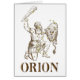 In der griechischen Mythologie war Orion ein starker Jäger. Er wurde manchmal gesagt, um der Sohn von Poseidon zu sein. Er fuhr die wilden Tiere aus der Insel von Chios heraus und fiel in Liebe mit Merope, Tochter des Königs der Insel. Missbilligend Orion, hatte der König ihn geblendet, aber seine Vision wurde durch die Strahlen des aufgehende Sonne wiederhergestellt. Er ging später zu Kreta, mit Artemis zu leben und zu jagen. Einige Legenden halten, dass er durch Artemis oder Apollo aus Eifersucht heraus getötet wurde; anders sagt, dass er tödlich durch einen Skorpion gebissen wurde. Nach seinem Tod legten die Götter ihn in den Himmel als Konstellation.