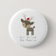 Ein niedlicher und festlicher Knopf mit minimalistischem Hipster. Charmante Illustration eines braunen Waldhirsches mit roter Weihnachtsmannmütze - Hipster Stil. Im Text steht: Trink, sei fröhlich.