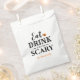 Diese beängstigenden niedlichen Halloween-Gefälligkeitstaschen enthalten den Satz "Trink essen und Beängstigend sein" in einem modernen schwarzen Typografie-Design mit einem orangen Jack o'lantern Kürbisakzent und Text, der mit deinen Namen oder Familiennamen personalisiert werden kann.