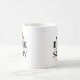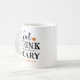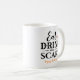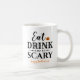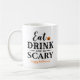 Diese beängstigende niedliche personalisierte Kaffee-Tasse zu Halloween enthält den Satz "Esst Drink and Be Beängstigend" in einem modernen schwarzen Typografie-Design mit einem orangen Jack o'lantern Kürbisakzent und Text, der mit "Happy halloween", einem Familiennamen oder einer anderen Textauswahl personalisiert werden kann.