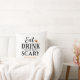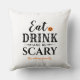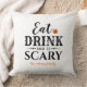 Dieses beängstigende niedliche Halloween-Kopfkissen zeigt die Phrase "Esst Drink and Be Beängstigend" in einem modernen, schwarzen Typografie-Design mit einem orangen Jack o'lantern Kürbisakzent. Personalisieren Sie das Skript mit Ihren Namen / Familiennamen oder mit anderen Texten wie "glücklich halloween". Weißer Hintergrund kann angepasst werden.