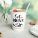Dieser beängstigende niedliche Halloween Party-Cup präsentiert den Satz "Esst Drink and Be Beängstigend" in einem modernen schwarzen Typografie-Design mit einem orangen Jack o'lantern Kürbisakzent. Personalisieren Sie das Skript mit Ihren Namen / Familiennamen oder mit anderen Texten wie "glücklich halloween". Weißer Hintergrund kann angepasst werden.