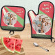Legen Sie Ihre Familie mit diesem Set in das Bild, das einen Ofen-Mitt und einen passenden Topfhalter enthält. Personalisieren Sie beide Artikel mit einem Lieblingsfoto und Ihren Namen(en). Der Hintergrund ist eine frische Wassermelone rot, mit farbigen Strahlen in heller Creme und hellgrün. Ihr eigener Text, z. B. Name(n), erscheint auf dem dunkelgrünen Bereich am Ende des Designs. Das Set ist eine helle und schicke Ergänzung zu Ihrem Koch-Accessoire und ist ein ideales Geschenk für Küche und Zuhause.