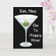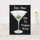 Ein Martini-Glas mit Wodka oder Gin und ein grüner Oliven- und Zahnstocher auf schwarzem Hintergrund. Essen, Nickerchen, Go To Happy Hour ist in Weiß geschrieben. Ein kleineres Bild des Getränkes ist innen mit dem Wunsch Sie einen guten Geburtstag Gruß. Behalten oder jeder Wortlaut kann geändert oder gelöscht werden. Ein lustiges Design, um einen Cocktail zu feiern.