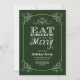 Moderne elegante Weihnachtsfeier Einladung Design mit whimsical Typografie, dass Eat, Drink und Be Merry liest. Der Hintergrund hat eine Grenze mit Vintagen Eckdaten. Verwenden Sie die Designtools, um Schriftart anzupassen, Text zu verschieben und Ihr eigenes einzigartiges Einladungs-Design zu erstellen.