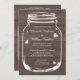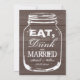 Essen Sie Getränk und seien Sie verheiratete Maurerglas-Hochzeitseinladungen. Brown- und schicke GlasWeckglashochzeit des weißen Landes lädt ein. Rustikaler hölzerner Kornplattenentwurf mit Vintagen verwitterten weißen Herzen/Liebesymbolen. Elegante Skripttypographie für Namen der Braut und des Bräutigams plus Datum. Niedliches Hochzeits-Set für Gartenscheunenheirat-/-paar-Grillen des Sommers im Juni, Juli im Freien, August, kundengerechten Text Septembers etc. und Luxuspapierqualität. Modisches DIY Thema. Kundenspezifische Hintergrundfarbe. Hübsche verblaßte Grungeartgraphiken und Zitat-/Sprichworttext.