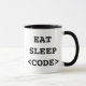 Essen Sie Schlafcode-Kaffee-Tasse für Programmierer. Niedliche Geschenkidee für nerdy Entwickler und Internet Geeks. Geeky Spaßtextentwurf. Machen Sie Ihre eigene lustige Parodie.