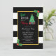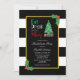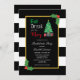 Iss, trinke und sei fröhliche Weihnachts-Junggeselinnen-Abschied-Einladung mit einem Weihnachtsbaum und Geschenke gegen einen goldenen Rahmen. Schwarz-Weiß-Streifenhintergrund mit holprigem Hintergrund