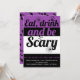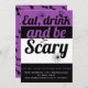 Essen, trinken und beängstigende Typografie lila Halloween-Party Einladung. Eine moderne Einladung, in der der Text "Essen, trinken und beängstigend sein" eine halbe Hexe, Fledermäuse und Spinnen auf lila, schwarzen und weißen Bändern präsentiert wird.