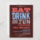 Mit dieser lustigen Einladung zum Sommergrill laden Sie Ihre Freunde zu einem Essen, Trinken und Entspannen ein. Diese Version verfügt über fröhliche Rot-, Blau- und Weißtönen auf einem tiefen, schokoladenbraunen Hintergrund mit leicht angepassten Textbereichen, die Sie mit Ihrer Info personalisieren können. Auf der Rückseite ist viel Platz, damit Sie Ihren eigenen zusätzlichen Text hinzufügen können.