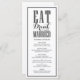Essen, trinken und verheiratet sein. Vervollständigen Sie Ihren Event-Tisch mit dieser individuell gestaltbaren Hochzeitsmenükarte. Es zeichnet sich durch moderne Kalligraphie und klassische Typografie aus, die sich perfekt für jedes Hochzeitsthema eignet. Personalisieren Sie diese, indem Sie Ihre Daten hinzufügen. Matching-Elemente sind verfügbar. Diese schwarz-weiße Menükarte ist in anderen Farben erhältlich.