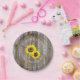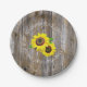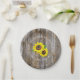 Rustikal, essen, trinken und Verheiratet sein Wetter Holz und Sonnenblumen Hochzeitstorte oder Vorspeise Papier Teller für den Empfang.