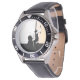 Diese exquisite Männeruhr besticht durch eine auffallende Silhouette eines Fischers, der in seinem Fang hisst und elegant schwarz geätzt wurde, vor einer sonnenbeleuchteten Stahlkulisse. Das Design erinnert an die ruhige Schönheit eines sonnigen Abends am Wasser und ist somit ein ideales Accessoire für Angelfreunde.