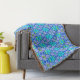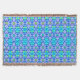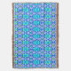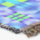 Estampado com imagem formas retangulares nas cores verde claro, azul céu ou turquesa e azul real escuro.. Sobre a imagem têm imagens transparentes levemente amareladas nos lados e diminuindo conforme se direciona ao centro, como o amarelo é transparente e está sobre a cor azul, torna-se esverdeado.