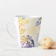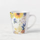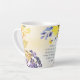 Die Tasse der Inspirationsschrift Latte zeigt ein einzigartiges Blumendesign mit gelben, orangefarbenen, lila und blauen Blumen und Blätter. Es enthält Bible Verse Ester 4:14, "Und wer weiß, ob du vielleicht schon so lange ins Königreich gekommen bist?"-