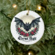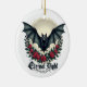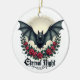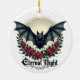 Bring the mystery of the night to your holiday decor with this gothic bat ornament. Featuring a black bat with outstretched wings against a glowing moon, encircled by red roses and dark foliage, this piece embodies the allure of "Eternal Night." Perfect for lovers of gothic elegance and dark aesthetics, adding a hauntingly beautiful touch to any collection.